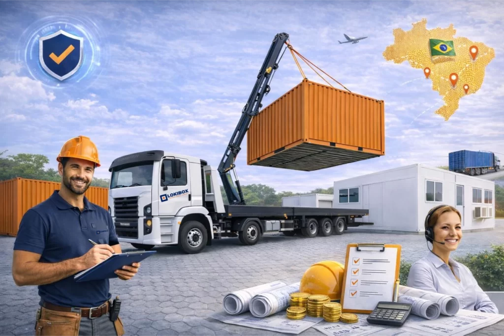 A LOKIBOX oferece soluções completas em containers e módulos habitáveis, com logística própria que garante a mobilização (entrega) e a desmobilização (retirada) no local, proporcionando tranquilidade ao cliente. Cuidamos de todas as etapas para assegurar agilidade, confiabilidade e continuidade ao seu projeto.
